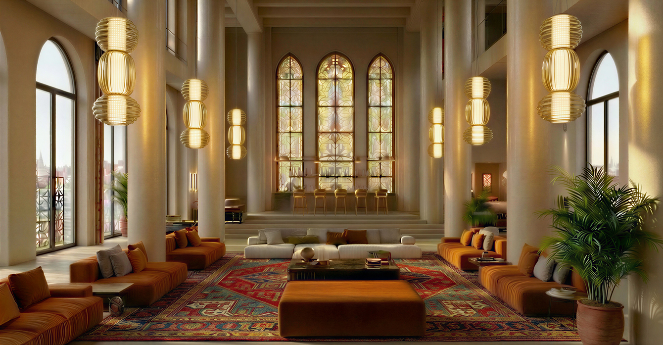 The boutique hotel unfolds as a quiet oasis within the city, shaped as a sequence of shared spaces designed for slowing down and retreat while discovering the city through a different lens: one that discreetly reveals local craftsmanship, forgotten traditions, and hidden layers of heritage. A main lounge invites reading and conversation, defined by soft details and an atmosphere of effortless ease. Beneath soaring columns and a warm stained glass glow, the space recalls a contemporary Venetian salon, where low seating, diffused light, and composed intimacy encourage guests to linger, converse, and lose all sense of time.