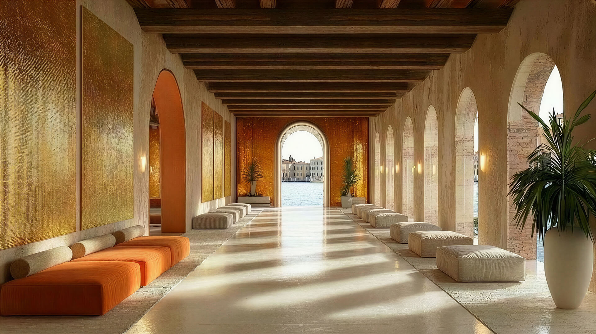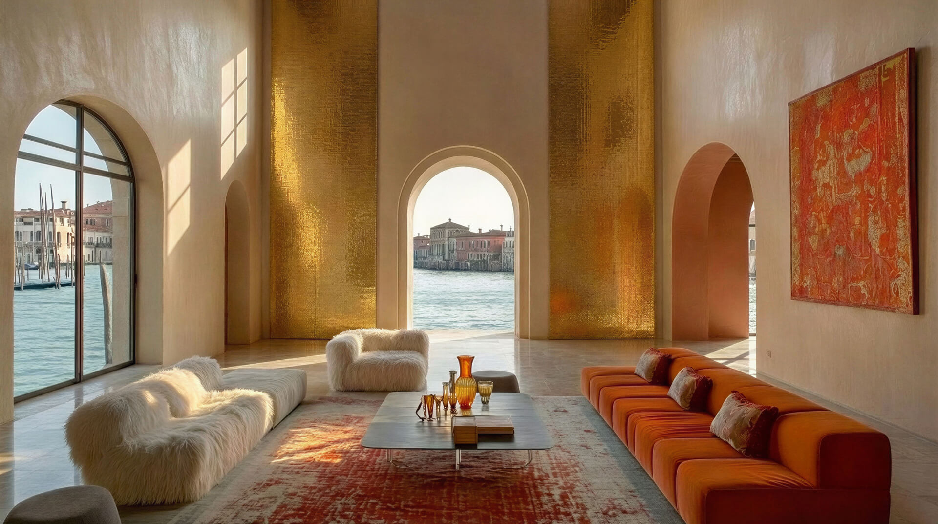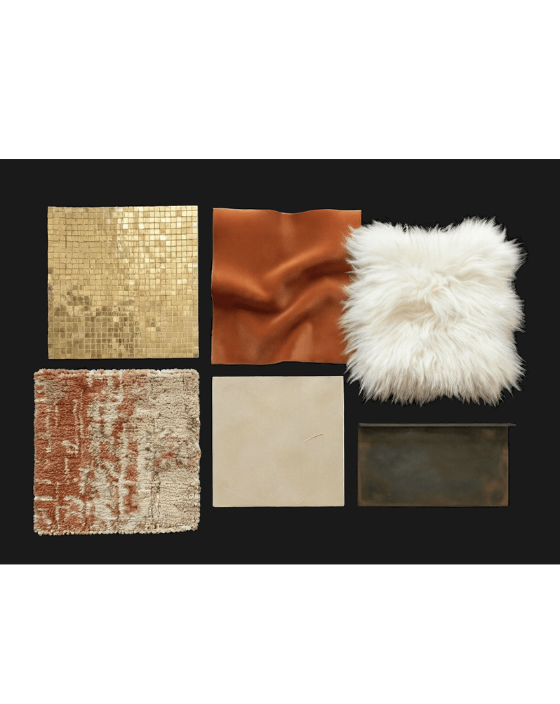 A material language of light, texture, and Venetian craft, ranging from blown glass and stucco veneziano through rich layered fabrics, mosaics and time-worn stones.