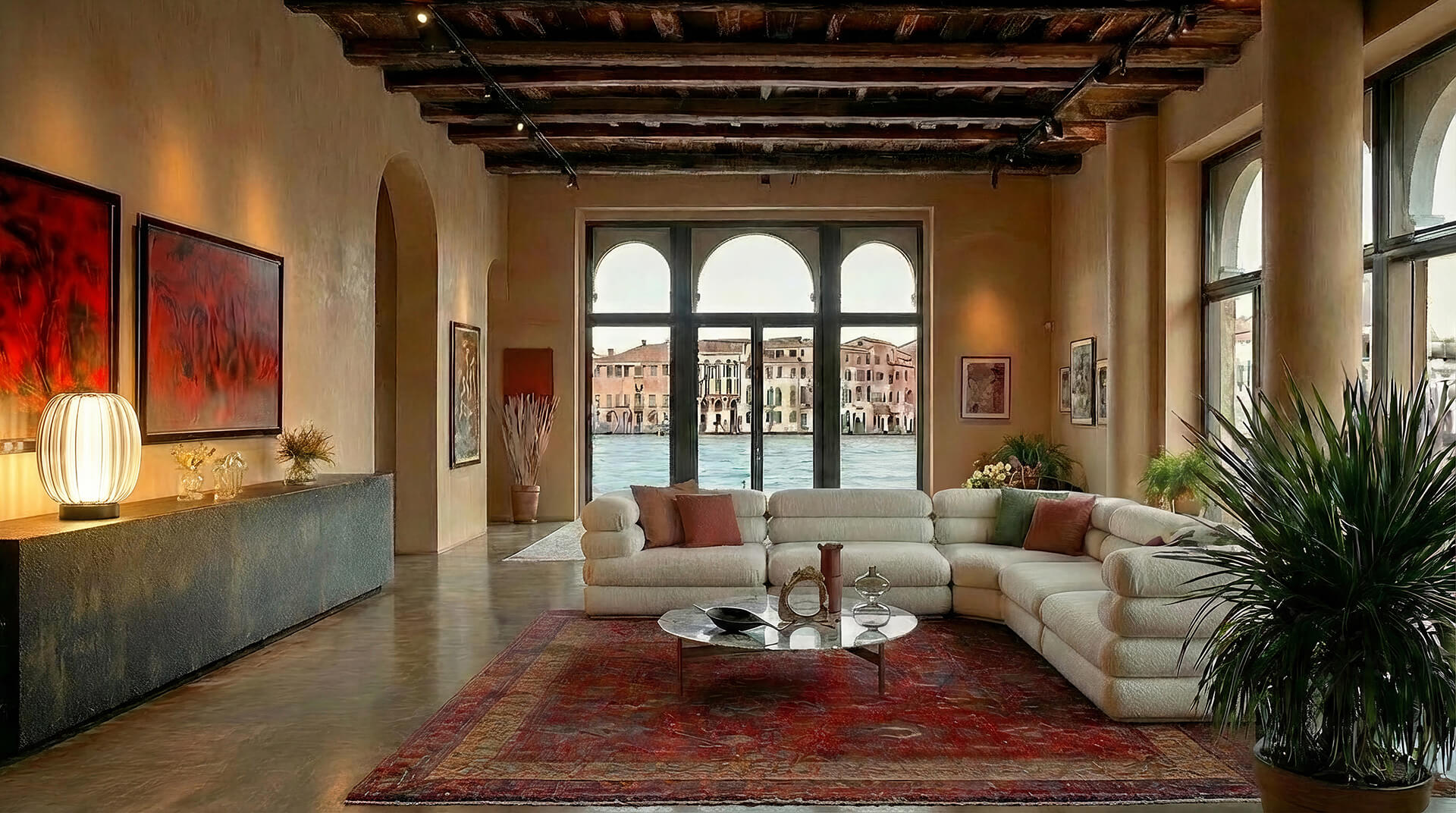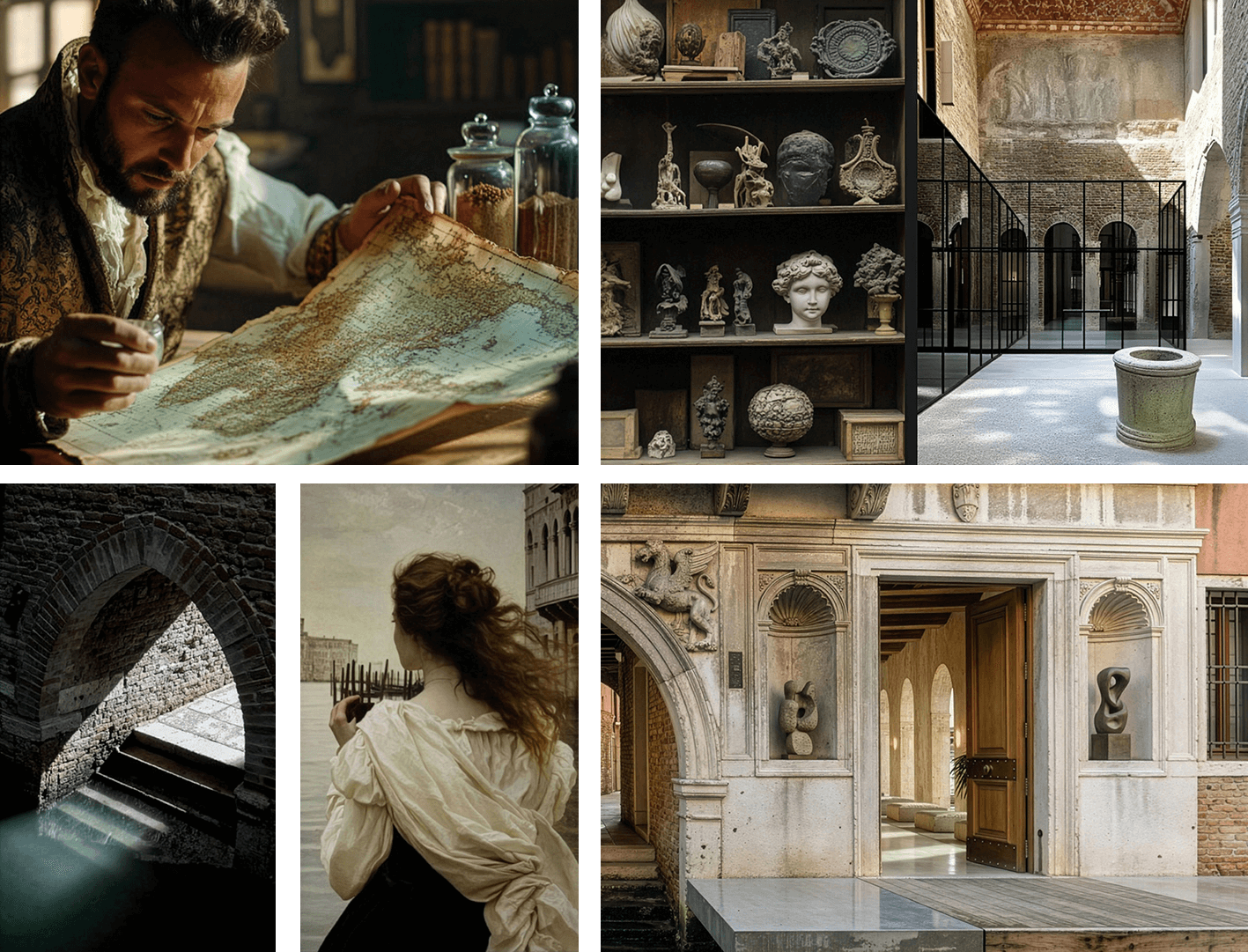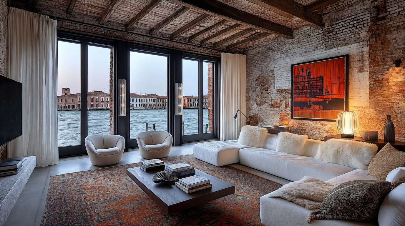 A material language of light, texture, and Venetian craft, ranging from blown glass and stucco veneziano through rich layered fabrics, mosaics and time-worn stones.