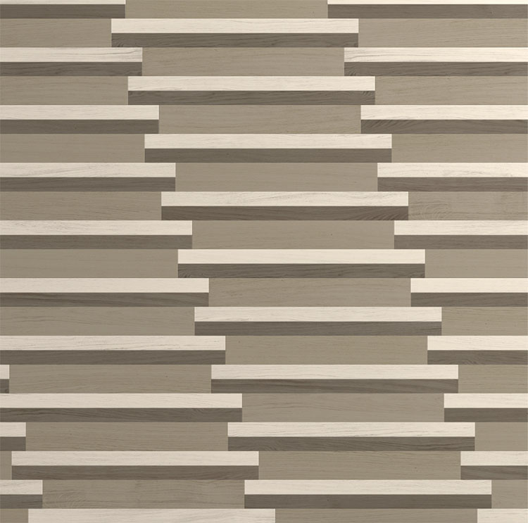 Its interlocking planks form a rhythmic interplay, creating unexpected geometries that draw the eye and shape spaces with character. Simple yet striking, the graphics recall the decisive patterns and bold visual language that have long distinguished Diesel’s fashion identity. The different wood tones alternate in regular sequences, enhancing the natural texture and craftsmanship of the material. The collection is available in color variations ranging from warm, enveloping honey and amber tones to sophisticated neutrals of white and gray, to adapt flexibly to any interior style.