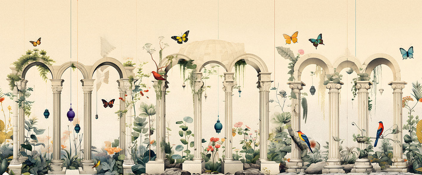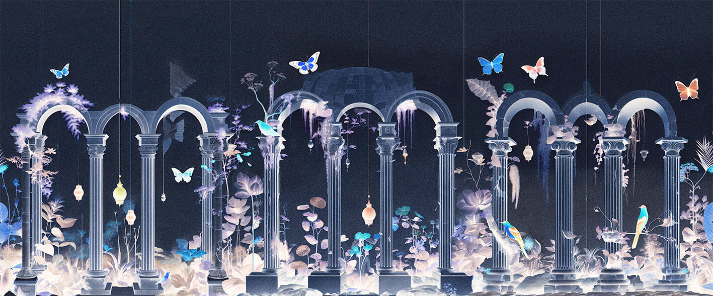 The Metacove wallpaper evokes a dreamlike tableau of ancient ruins slowly reclaimed by flourishing flora and fauna. Offered in two colourways, Daytime and Nocturnal, it brings a sense of depth, atmosphere and quiet storytelling to any interior.