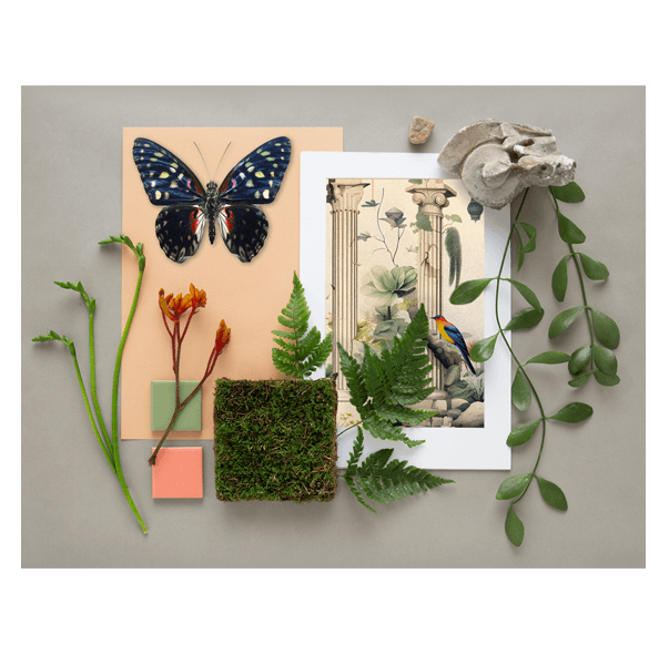 The Metacove moodboard weaves together a world suspended between imagination and reality. Butterflies, soft moss tones and fragments of ancient ruins sit alongside AI-generated imagery, creating a visual bridge between the mythical realm of Metacove and the physical world it inspires.