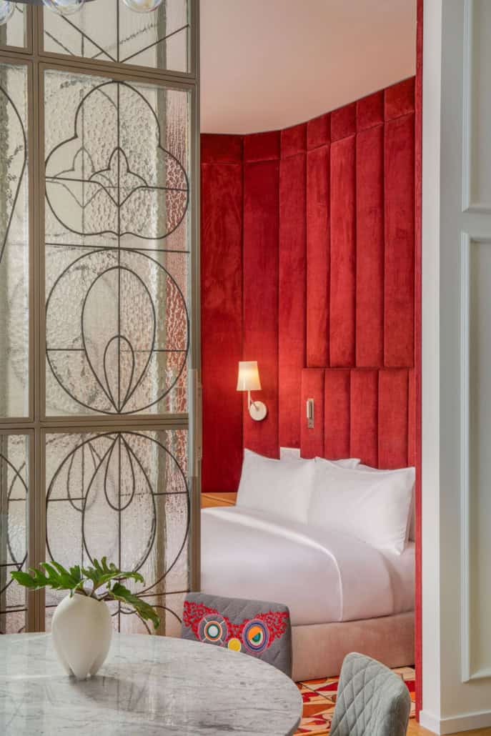 Each bedroom carries its own character, with one room type featuring stained glass as a defining element. Integrated into the dividing doors, it introduces colour, light and subtle privacy to the space. The motif continues throughout the project, creating a cohesive visual thread and a crafted sense of continuity from room to room.