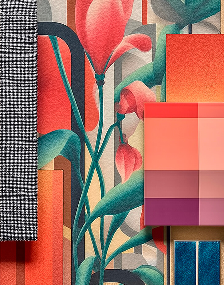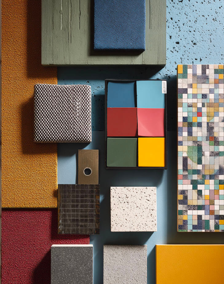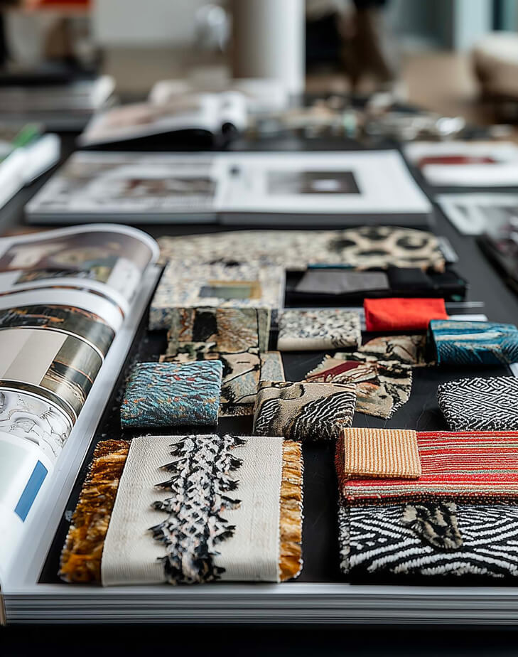 The studio provides advisory services grounded in material and surface research, supported by trend insights. This includes strategic concept development, colour guidance for soft and hard finishes, and surface advisory for textiles, rugs and wallpapers.